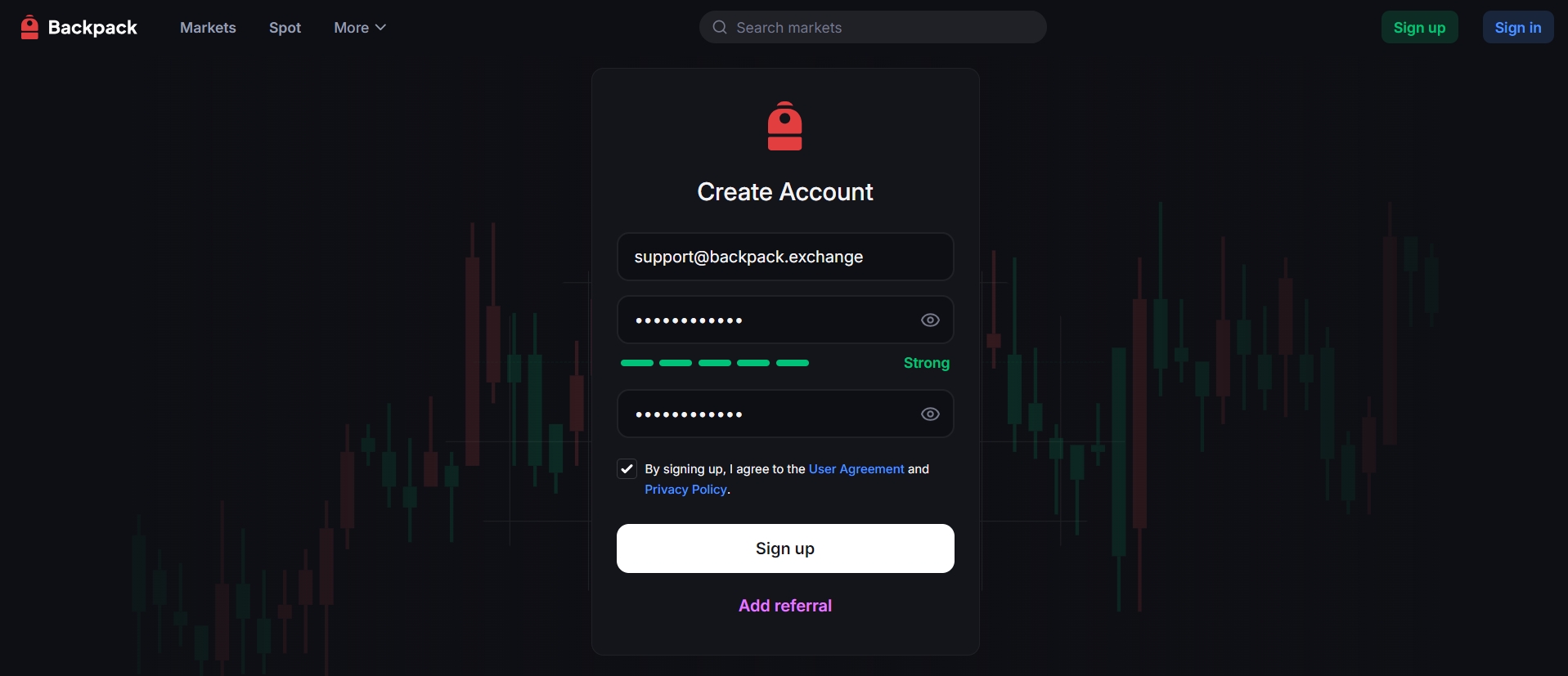You'll need to register first before you can start trading on Backpack Exchange. Setting up your account on Backpack Exchange is simple and straightforward.