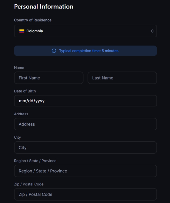 2) Enter your Country of Residence and provide full name, date of birth and address.