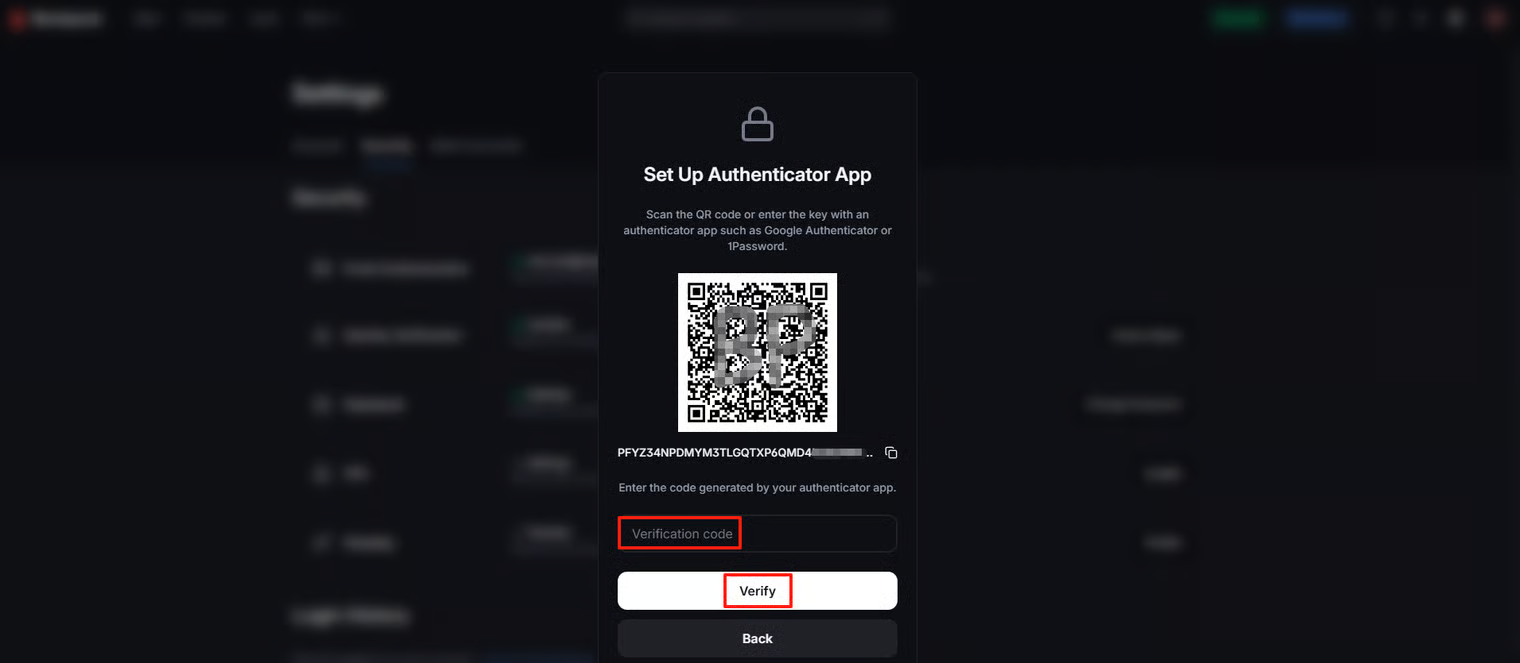 3. Scan the QR code with an authenticator app (e.g., Google Authenticator), then enter the **Verification Code** in the field below and click **Verify**.