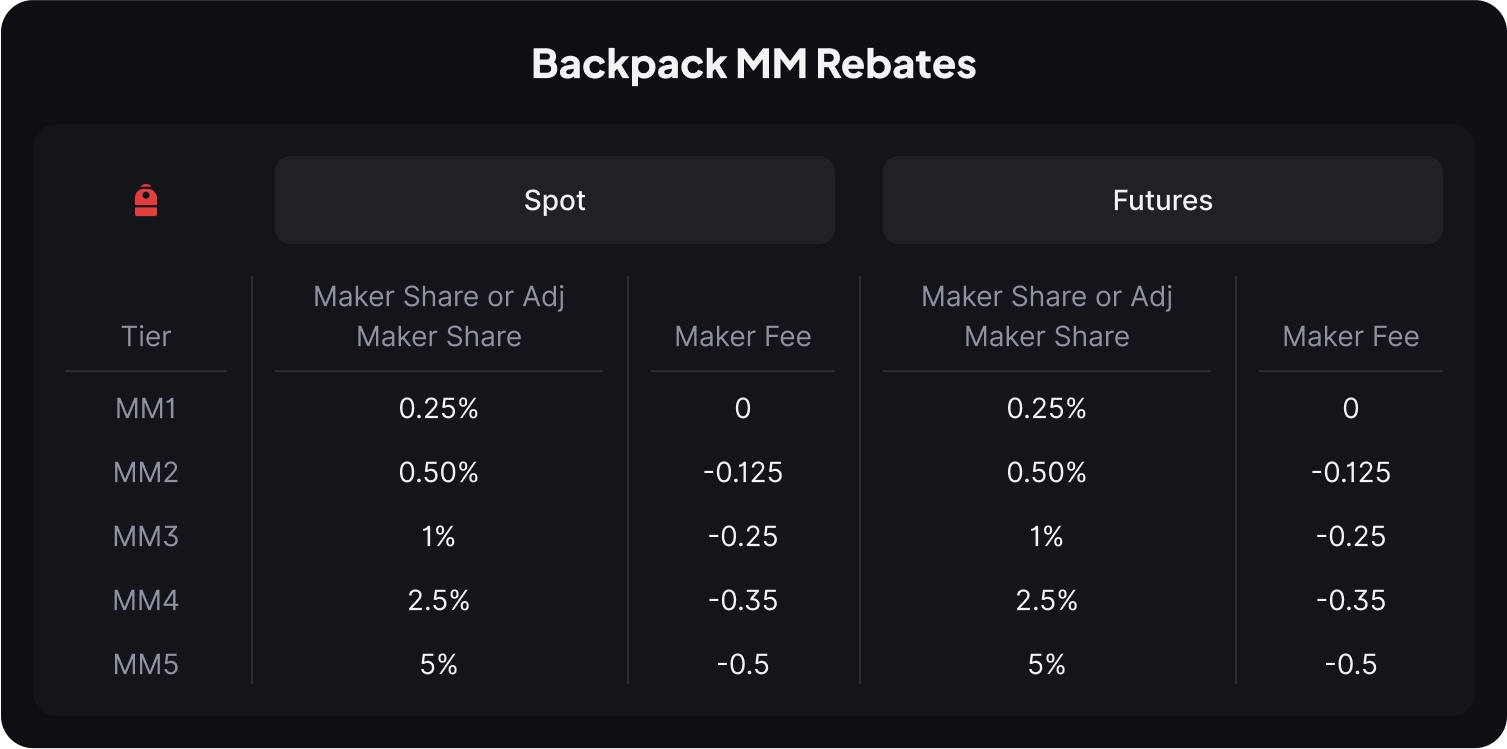 Todos los MM nuevos disfrutarán de tarifas de maker MM5 durante su primer mes; después de eso, las comisiones se determinarán según la participación del usuario en el mercado y los volúmenes al final del período de vacaciones de tarifas. Backpack Exchange no ofrece ni ofrecerá acuerdos especiales de comisiones con ningún market maker. La estructura de comisiones es la misma para todos los market makers.