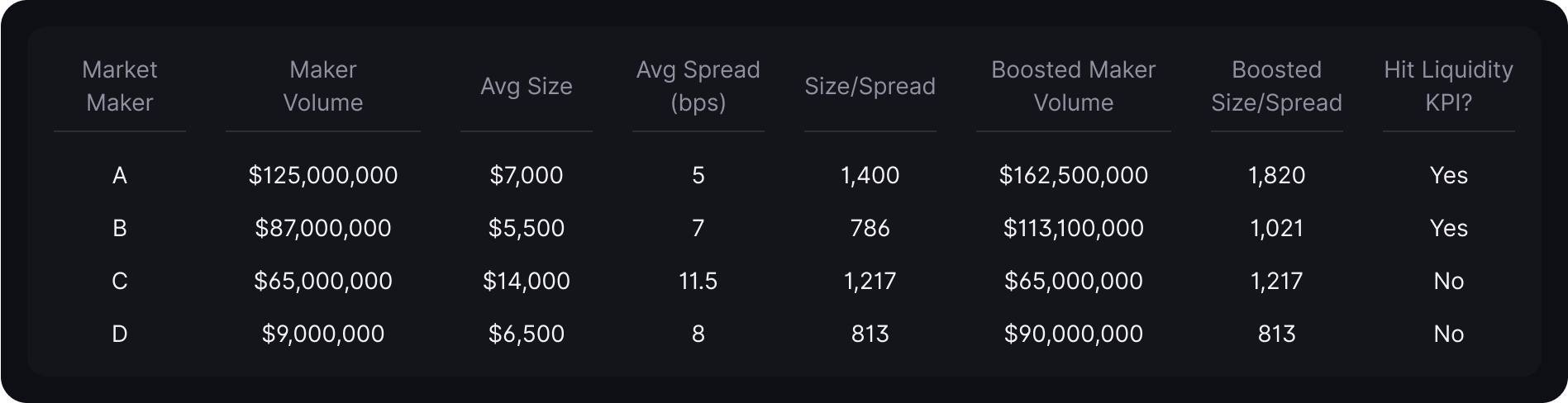 Los Market Makers (MMs) que mantengan KPIs de liquidez durante al menos el 80% del mes recibirán un aumento del 30% en su Volume Score y Liquidity Score en los pares relevantes donde cumplan con el KPI. Este aumento se tomará de la asignación que de otro modo iría a los MM que caen por debajo del umbral del 80% de tiempo de actividad.