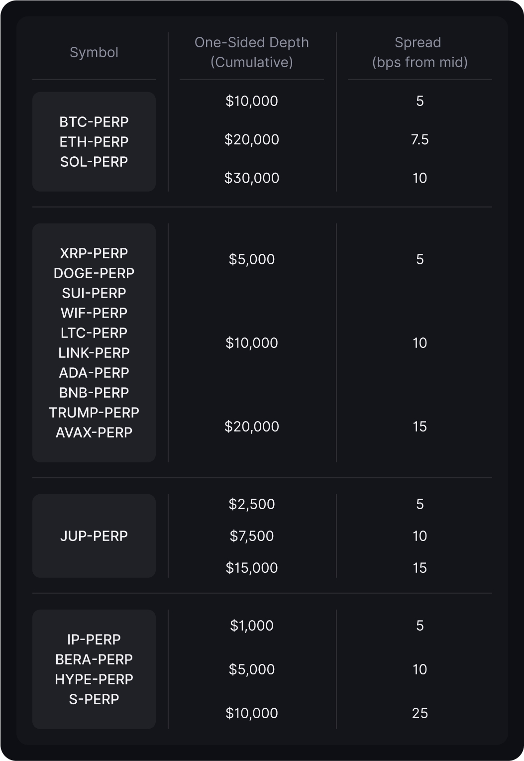 Los valores de One-Sided Depth mostrados arriba representan la liquidez mínima requerida en cada lado del libro de órdenes (oferta y demanda) de manera independiente. Por ejemplo, un requisito de profundidad de $10,000 significa que los market makers deben mantener al menos $10,000 en órdenes tanto en el lado de compra como en el lado de venta por separado, dentro del nivel de spread especificado.