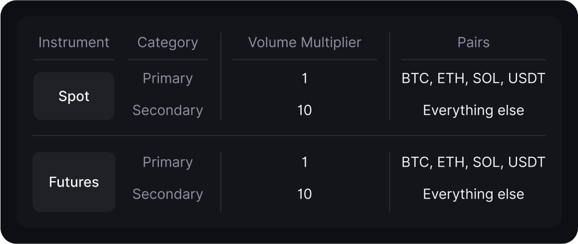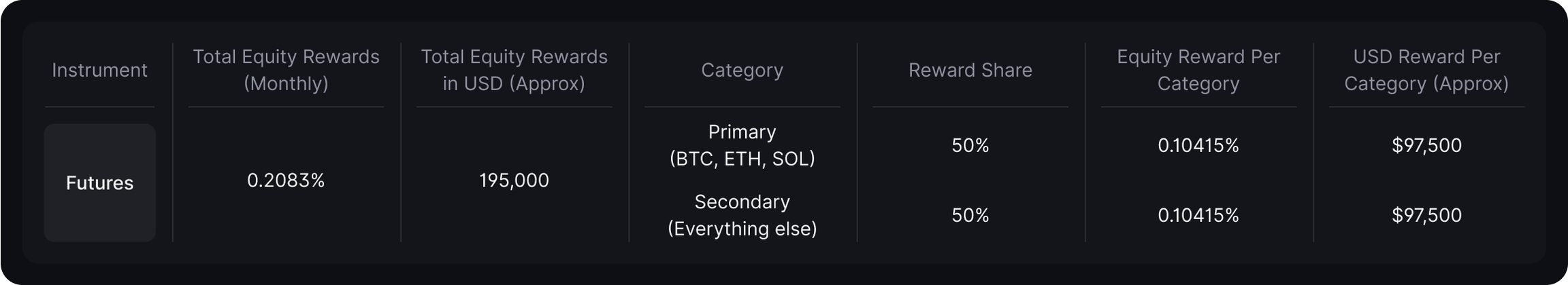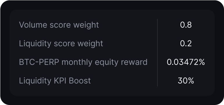 Общий пул вознаграждений для основных пар делится поровну между BTC-PERP, ETH-PERP и SOL-PERP. Каждая основная пара получает 0.03472% от общего пула вознаграждений.