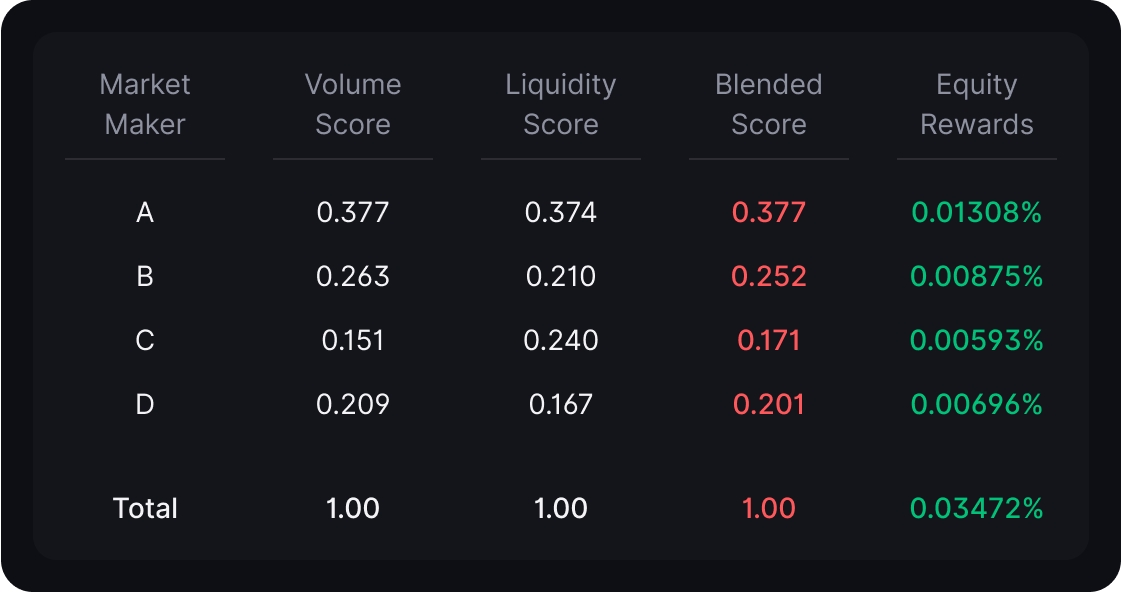 - Балл ликвидности (Liquidity Score) = ваш показатель ликвидности / сумма показателей ликвидности всех маркет-мейкеров