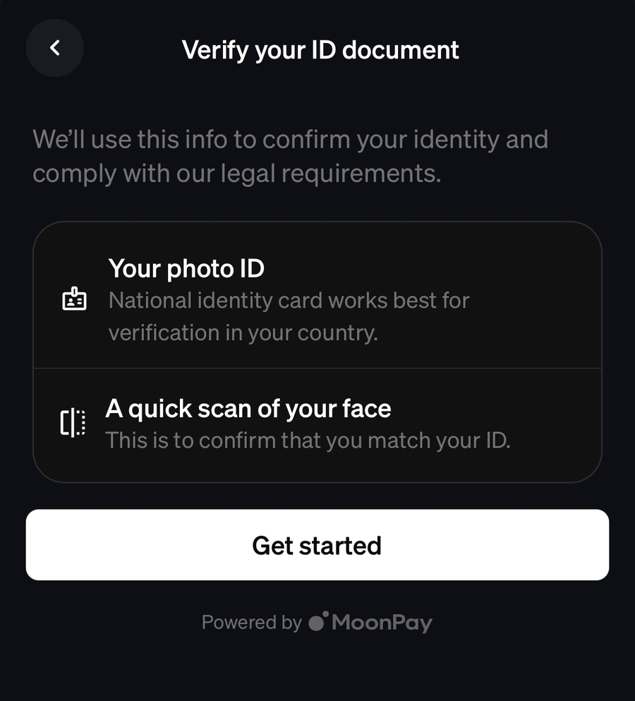 Примечание: При первом использовании MoonPay вам будет предложено авторизоваться непосредственно через интерфейс MoonPay. В рамках их требований по соблюдению нормативов вам потребуется предоставить личную информацию и пройти процедуру верификации личности (KYC), прежде чем транзакция сможет быть обработана.
