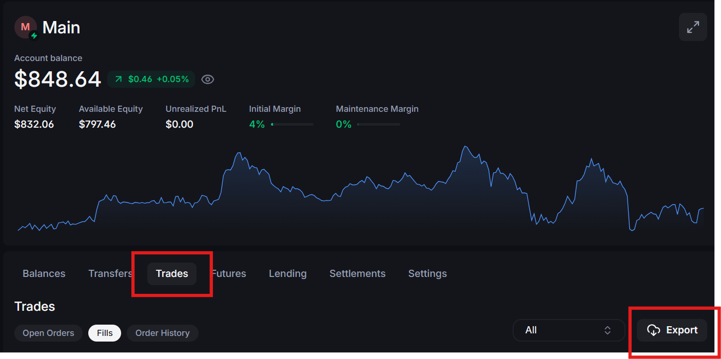 2) Chuyển sang tab "Trades" (Giao dịch)